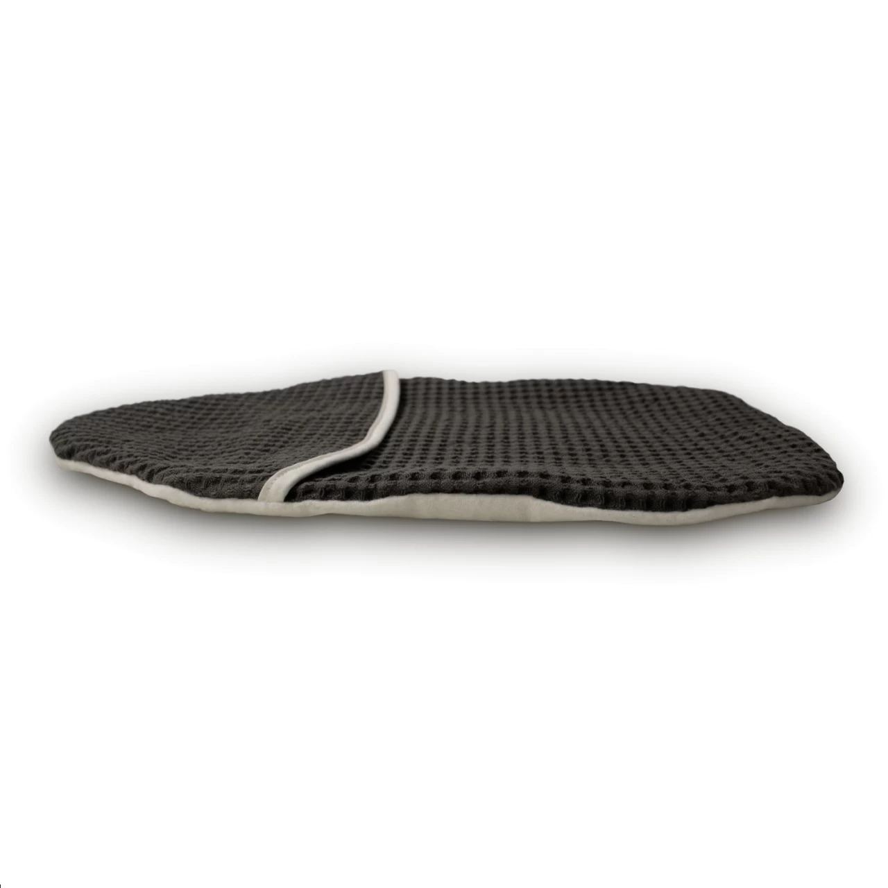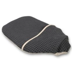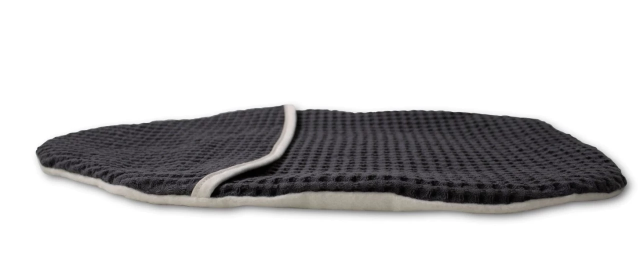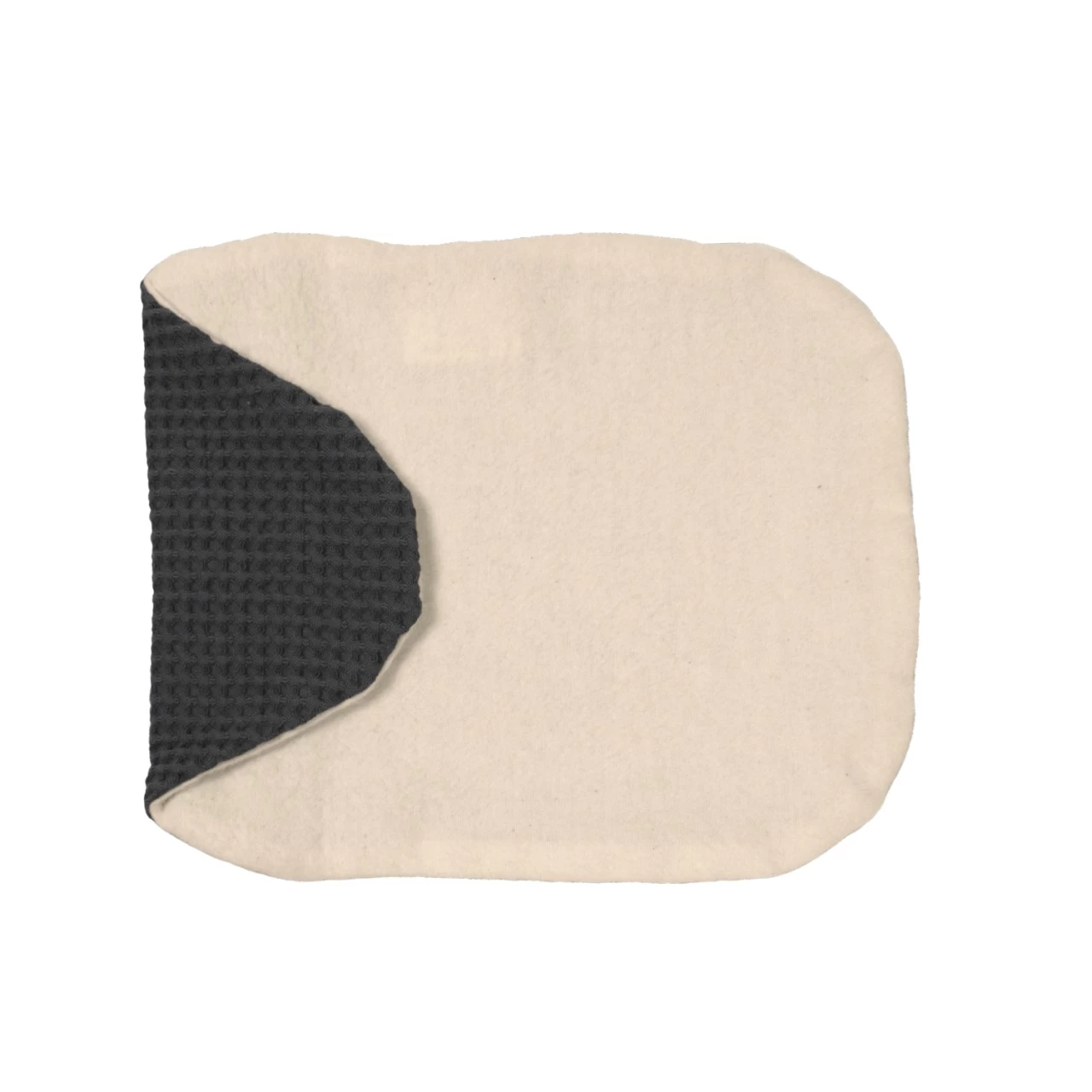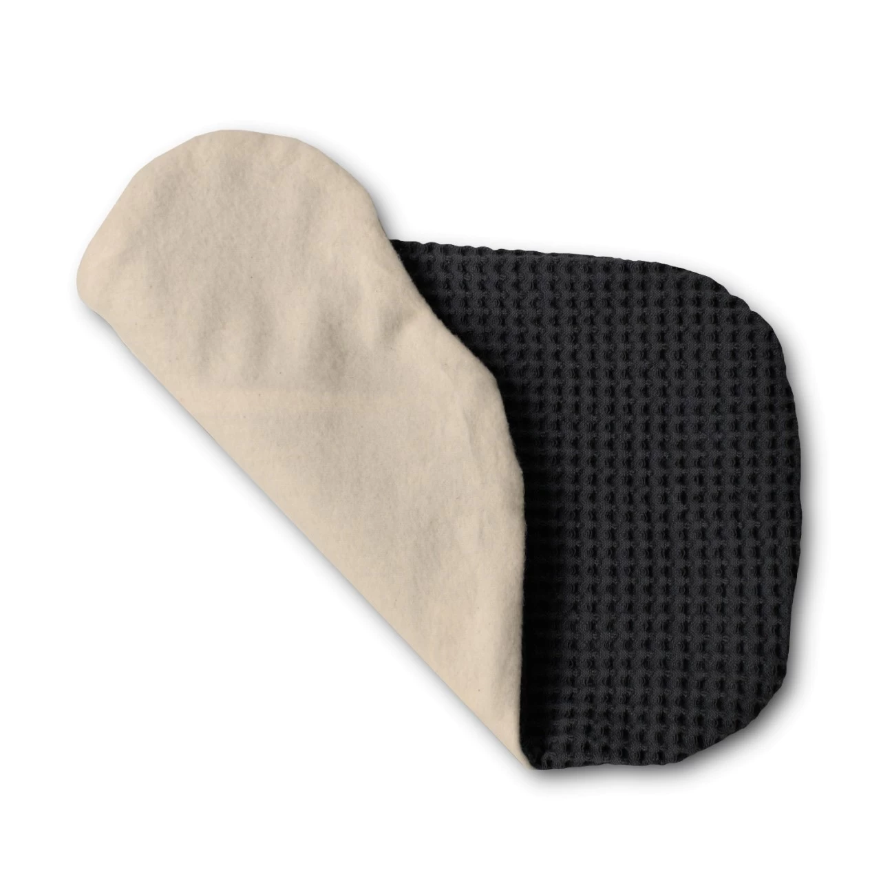 Zum einen den anthrazitfarbenem Waffellpikee und zum anderen naturbelassenen, ungefärbten Flanell. Beides Baumwolle aus Bio-Anbau. Wafellpikee ist strukturiert. Beim darüber streicheln spürt man die Oberflächenstruktur. Flanell ist angeraut und fühlt sich somit weich und wohlig an.