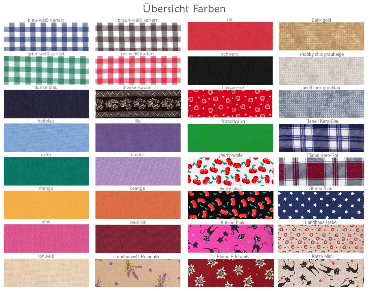 Wir bieten Ihnen unsere Stoffe in Baumwolle mit einem passenden Band aus Polyester an.